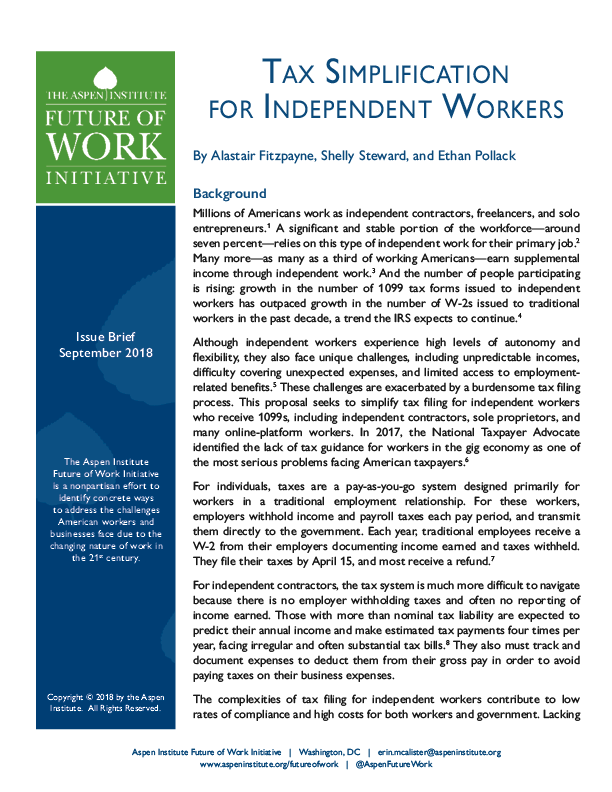 This proposal targets the complexity of tax filing among independent workers. Its goals are to update the U.S. tax code to make the filing process simpler, to make independent workers’ income more transparent and comparable to that of traditional workers, and to increase tax compliance.