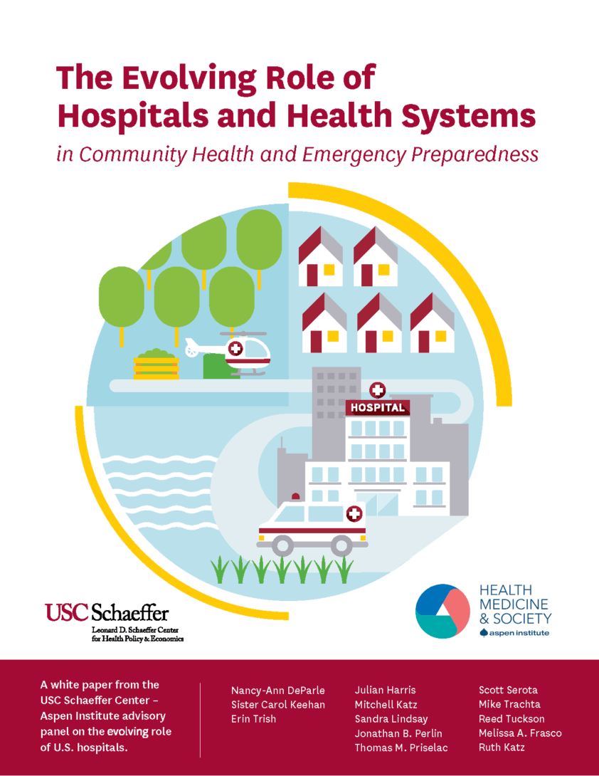 The COVID pandemic demonstrated the extraordinary dedication and resilience of the nation’s hospitals. But it also exacerbated longstanding financial pressures, workforce stability and shifts in the nature and expectations of care – trends that continue despite the lessening of the pandemic.In addition to addressing medical needs, today’s hospitals are expected to be a critical component of a broader system that deploys non-clinical approaches to improving health, preventing disease and reducing health disparities – something known as “community health” – while also preparing for emergencies. In this report, a panel of experts convened by theUSC Schaeffer Center for Health Policy & Economicsand theAspen Institute’s Health Medicine & Society Program offer recommendations for how hospitals can evolve to meet growing expectations while remaining financially viable.