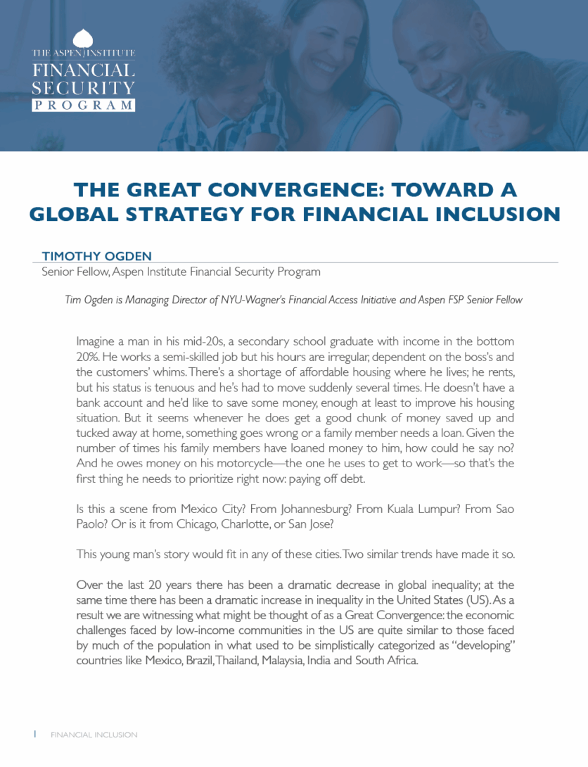 This piece dives deeper into Ogden’s observations about the shared challenges and areas of growth within the landscape of global inclusion. It also proposes the need for a global financial inclusion strategy. Read Ogden’s piece, The Great Convergence to learn how financial inclusion efforts around the world are growing more relevant to the structural policies developed in the US, and vice versa.
