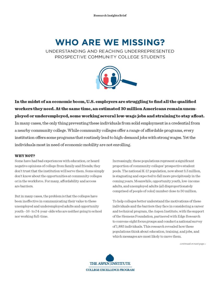 In 2018 – 2019, the Aspen Institute, with support from the Siemens Foundation, conducted eight focus groups and a national survey to better understand how unemployed, underemployed, and opportunity youth populations think about work, training, and community college. This brief summarizes our findings.