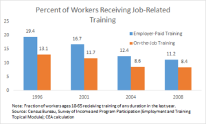 Unfortunately, based on the data available, businesses have been investing less in their workers, not more. From 1996 to 2008, the percentage of workers receiving employer-sponsored or on-the-job training fell 42 percent and 36 percent, respectively (see chart below).[8] This decline was widespread across industries, occupations, and demographic groups.[9] Between 2003 and 2013, the number of formal programs that combine on-the-job learning with mentorships and classroom education – generally considered to be the most effective programs – fell 40 percent.[10]