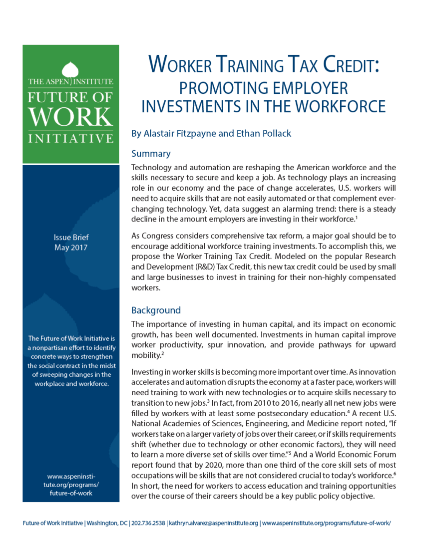 As Congress considers comprehensive tax reform, a major goal should be to encourage additional workforce training investments. To accomplish this, we propose the Worker Training Tax Credit. Modeled on the popular Research and Development (R&D) Tax Credit, this new tax credit could be used by small and large businesses to invest in training for their low- and middle-income workers.