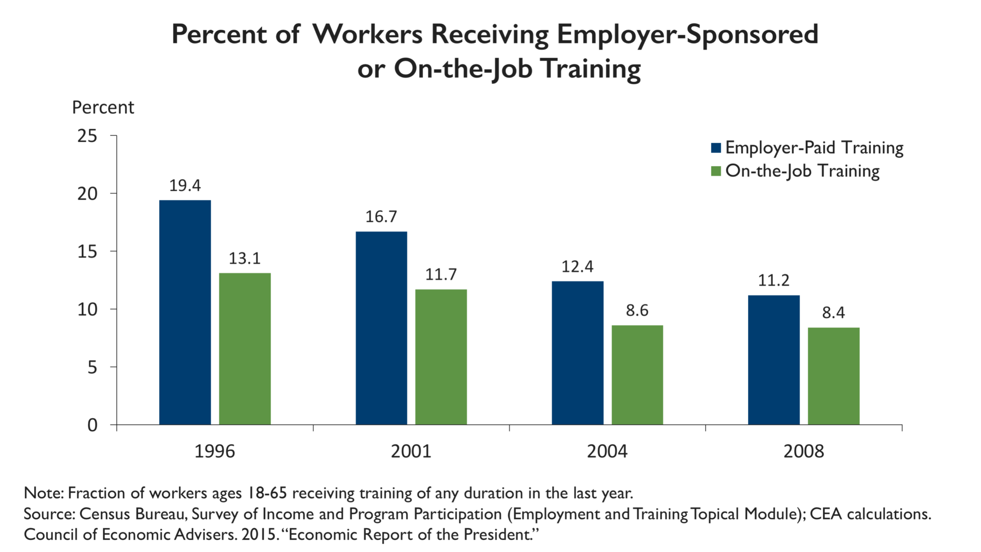 [9] Council of Economic Advisors. 2015. “Economic Report of the President.” https://obamawhitehouse.archives.gov/sites/default/files/docs/cea_2015_erp_complete.pdf. More recent data on employer-provided training has been mixed. Data from the Society for Human Resource Management suggests that employer-provided tuition assistance has been falling in recent years, from 66 percent of surveyed businesses offering tuition assistance benefits in 2008 down to 53 percent in 2017. Meanwhile, data from the Association for Training & Development suggests that employer training investments have been roughly flat over the last decade. Society for Human Resource Management. 2017. “2017 Employee Benefits: Remaining Competitive in a Challenging Talent Marketplace.” https://www.shrm.org/hr-today/trends-and-forecasting/research-and-surveys/Documents/2017%20Employee%20Benefits%20Report.pdf. Association for Talent Development. 2017. “2017 State of the Industry.” December. https://www.td.org/research-reports/2017-state-of-the-industry.