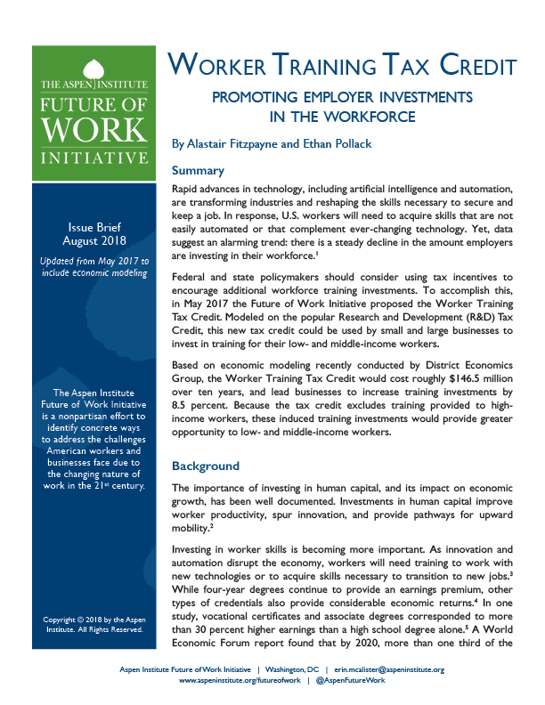 Federal and state policymakers should consider using tax incentives to encourage additional workforce training investments. To accomplish this, in May 2017 the Future of Work Initiative proposed the Worker Training Tax Credit. Modeled on the popular Research and Development (R&D) Tax Credit, this new tax credit could be used by small and large businesses to invest in training for their low- and middle-income workers.