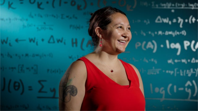 A woman in a red sleeveless top stands in from of a wall of mathematical equations. Photo credit: Jordan Stead / Amazon.