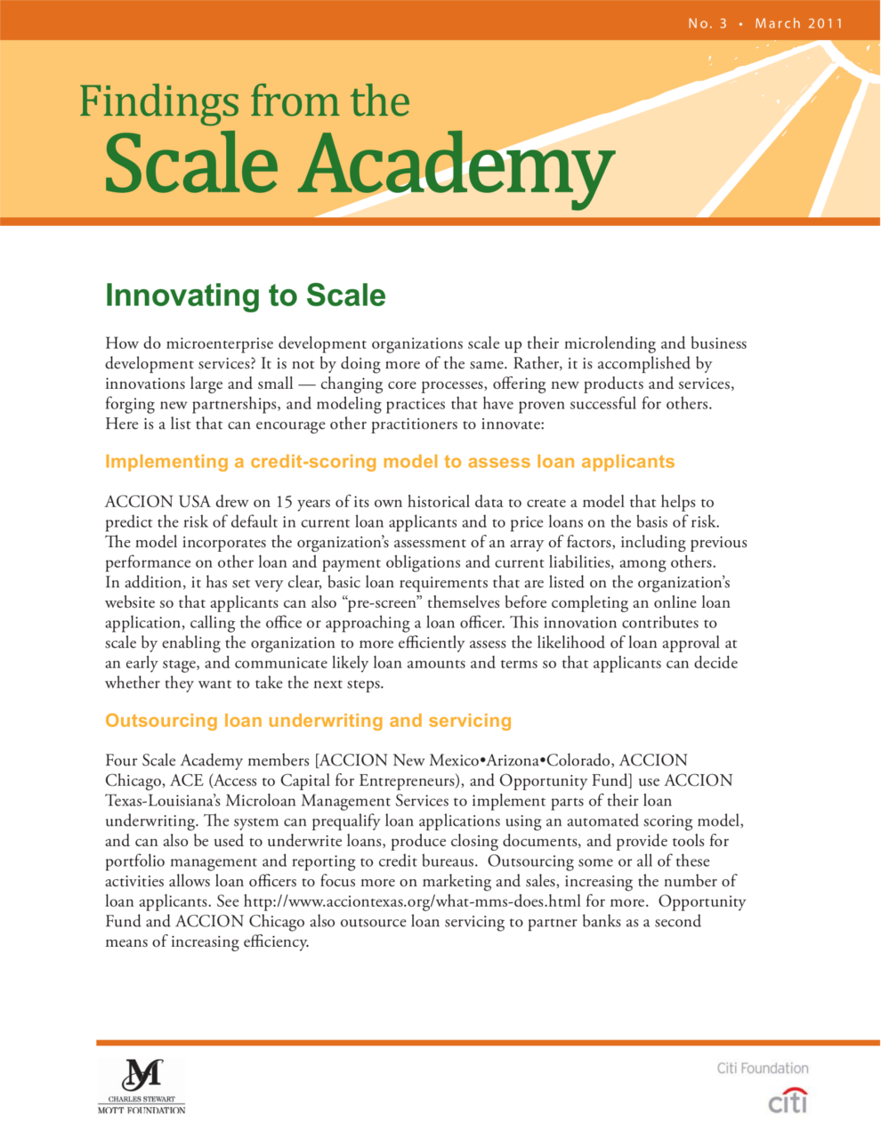 This publication discusses the experiences of five leading microfinance organizations, which participate in the Scale Academy for Microenterprise Development.
