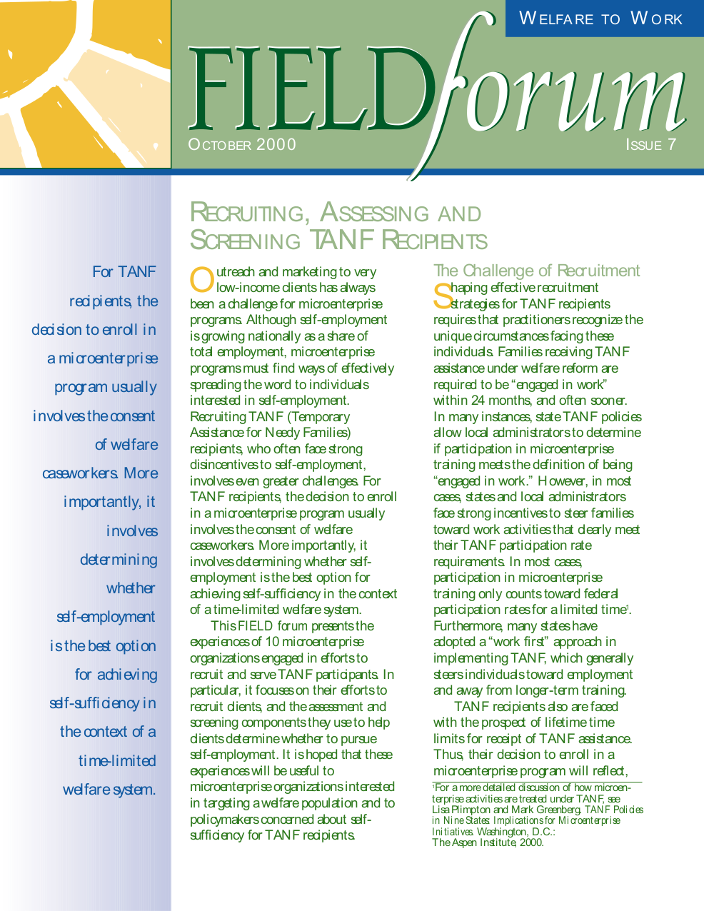 FIELD Forum Issue 7 – Recruiting, Assessing, and Screening TANF Recipients