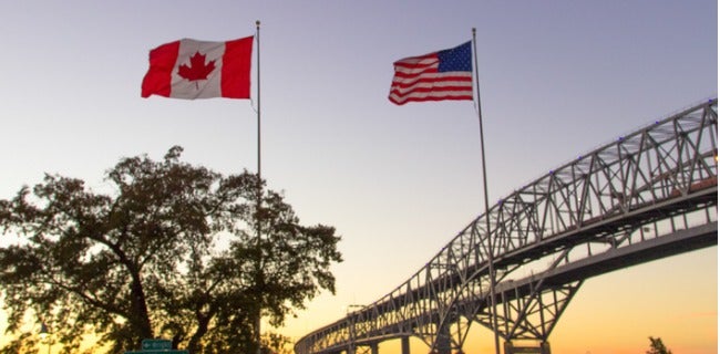 The Cnadian and American flags flying at the International Blue Water Bridge Crossing.