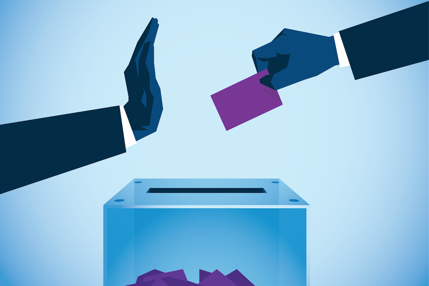 An illustration of a hand blocking another from putting their vote in the ballot box. It represents a negative view of AI and the future of civil rights.