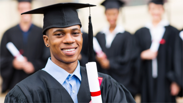 Student in graduation cap and gown, holding a diploma