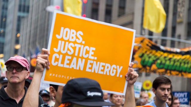 Photo of a person carrying a placard supporting "Jobs, Justice, Clean Energy".