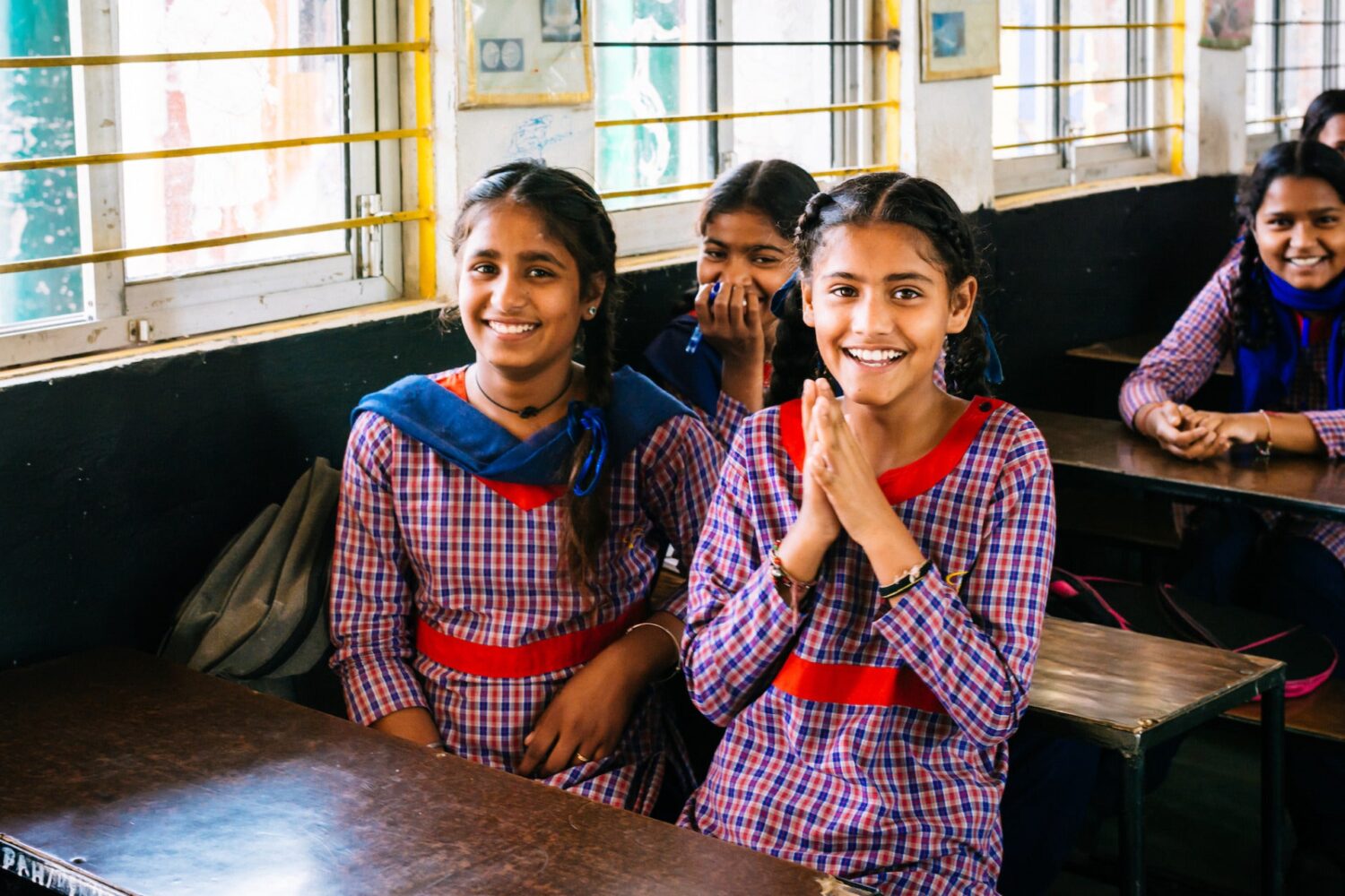 A group of young students sit at wooden desks smiling at the camera.