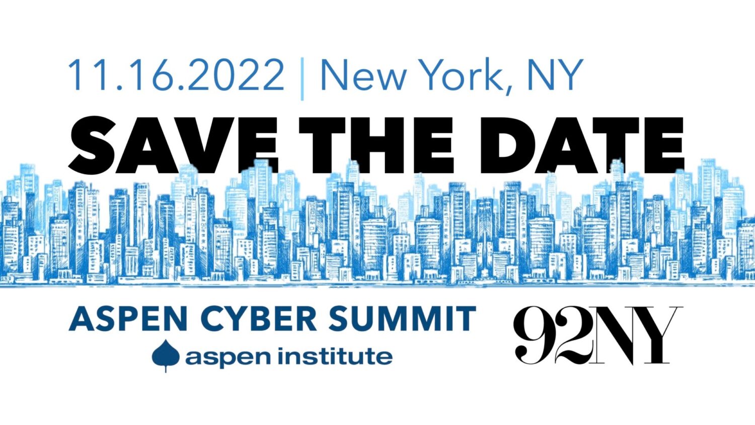 "Save the Date: Aspen Cyber Summit. November 16, 2022, in New York, New York with 92NY." Image includes a sketch of the New York City skyline.