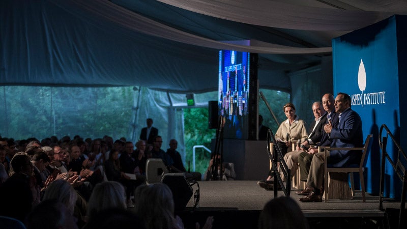 Governor Matt Bevin of Kentucky, Governor Larry Hogan of Maryland, and Governor Pete Ricketts of Nebraska in conversation with The Honorable Ann Korologos, Chair Emeritus of the Aspen Institute and former US Secretary of Labor under President Reagan.