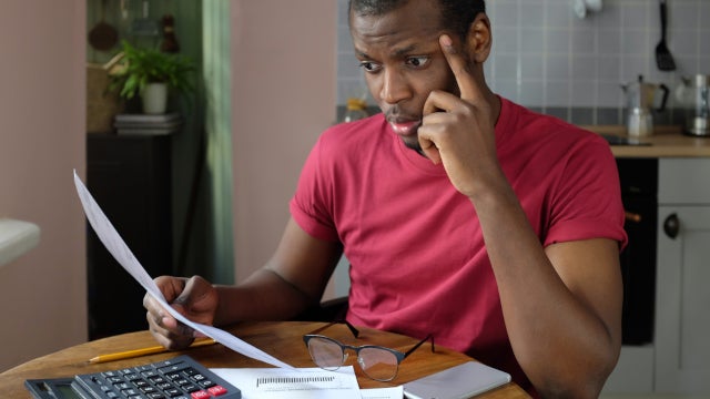 Photo of a concerned Black business owner staring at financial documents in front of a laptop, with glasses and calculator nearby