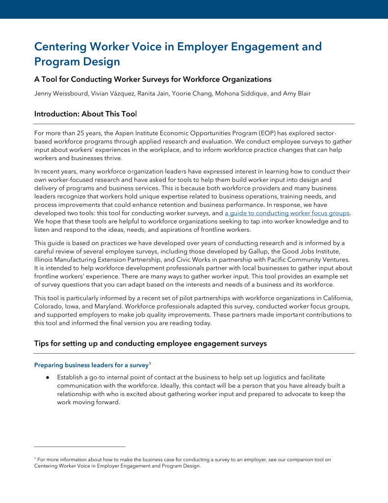 Cover page for the publication "Centering Worker Voice in Employer Engagement and Program Design: A Tool for Conducting Worker Surveys for Workforce Organizations"
