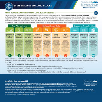 This piece of the Thrive Rural Framework, the Systems-Level Building Blocks, includes driving forces and conditions that are in larger systems outside the direct control of individual rural communities or regions.