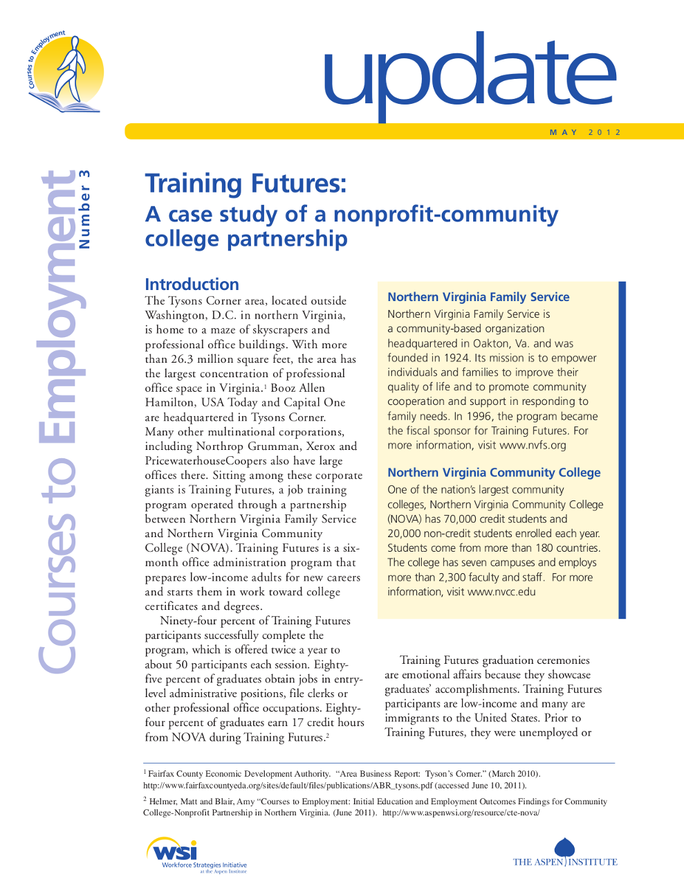 This report details the initial findings from longitudinal research on the education and employment outcomes of students who enrolled in Northern Virginia Family Service’s Training Futures (business and medical office administration training) program between 2007 and 2010.