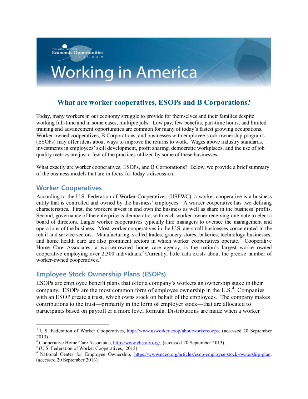 Fact Sheet on Worker Cooperatives, ESOPs, and B Corporations