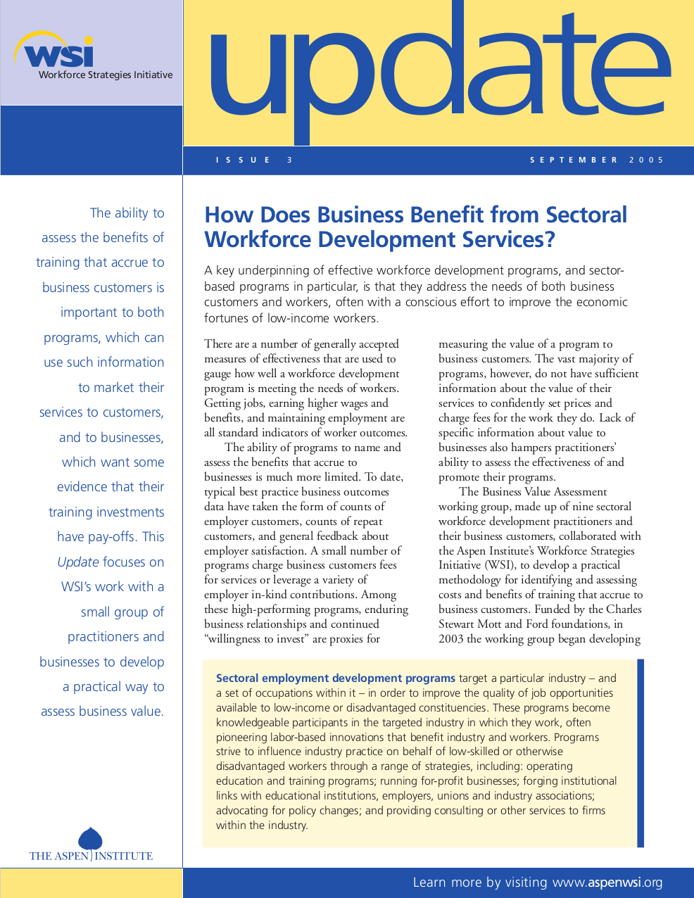 This issue describes the lessons learned from nine sectoral workforce development programs and their business customers as they worked with WSI to create a process for assessing the value of their services from the employers’ perspective.
