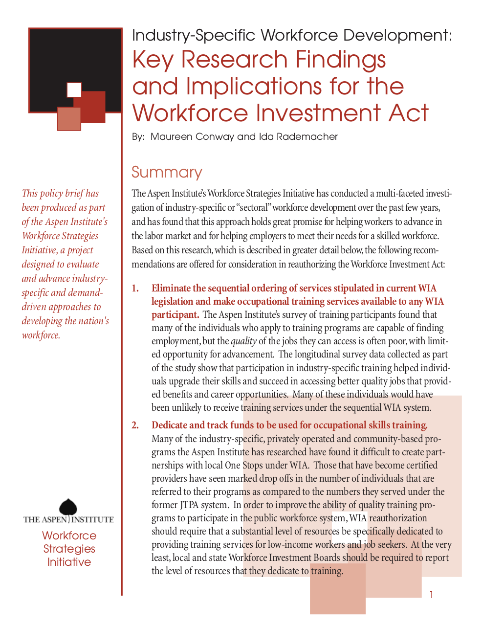 Key Research Findings and Implications for the Workforce Investment Act, a new policy brief from WSI, draws on findings from a multi-faceted investigation of industry-specific or “sectoral” workforce development, to offer an overview of this research and discuss implications for Workforce Investment Act legislation.