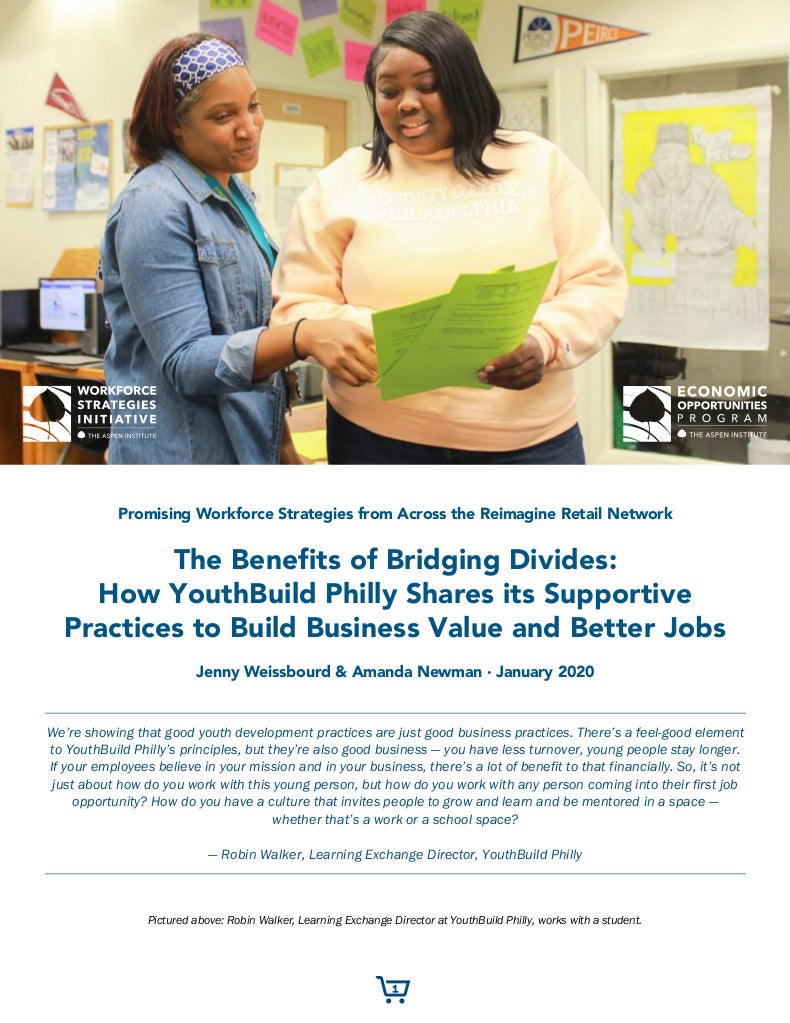Cover page: "The Benefits of Bridging Divides: How YouthBuild Philly Shares its Supportive Practices to Build Business Value and Better Jobs"
