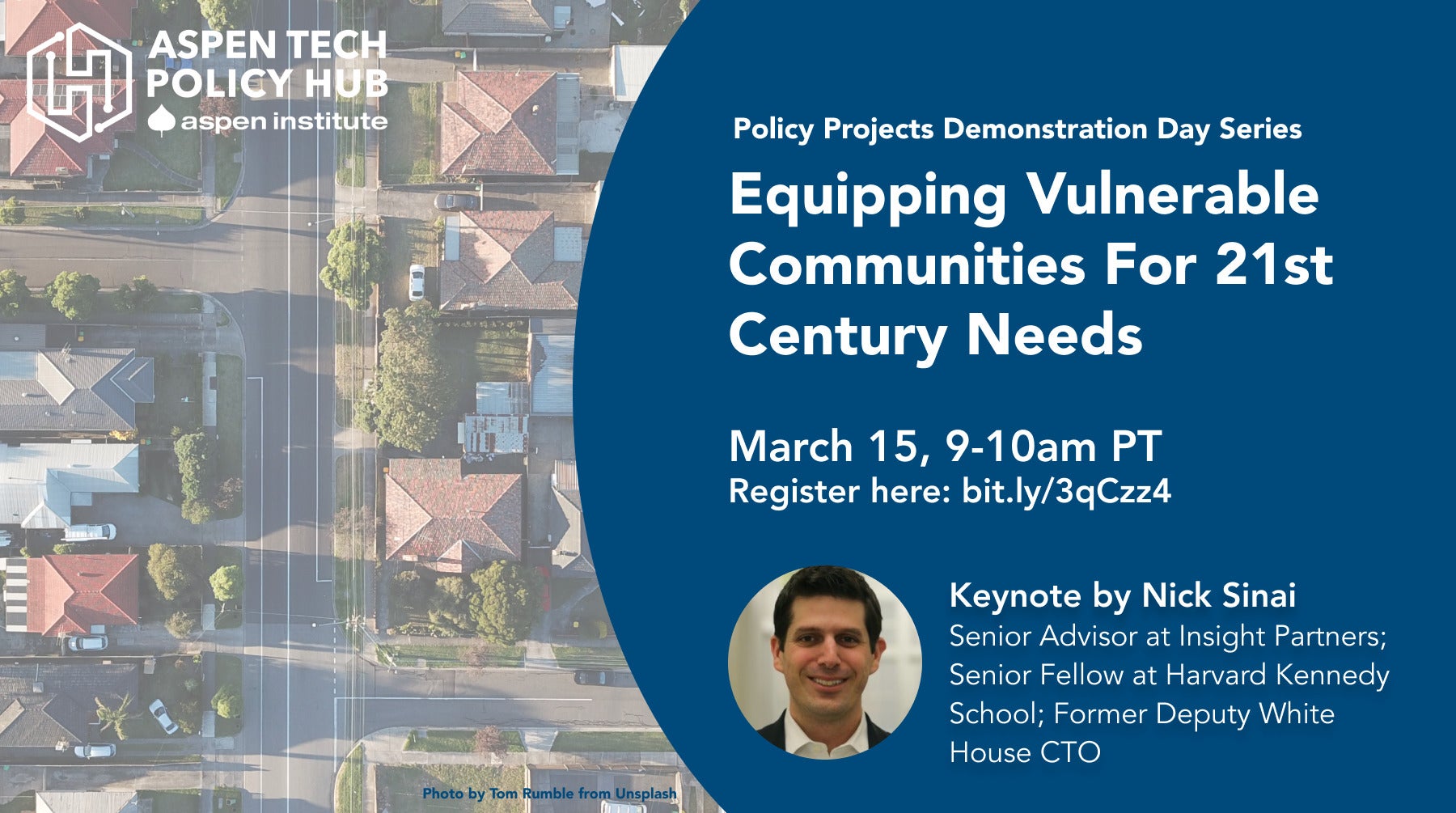 Three Fall 2021 Hub Fellows presented their innovative policy ideas focused on “Equipping Vulnerable Communities for 21st Century Needs.” Following the presentations of the projects, Nick Sinai, Senior Advisor at Insight Partners and former US Deputy Chief Technology Officer, gave further remarks.