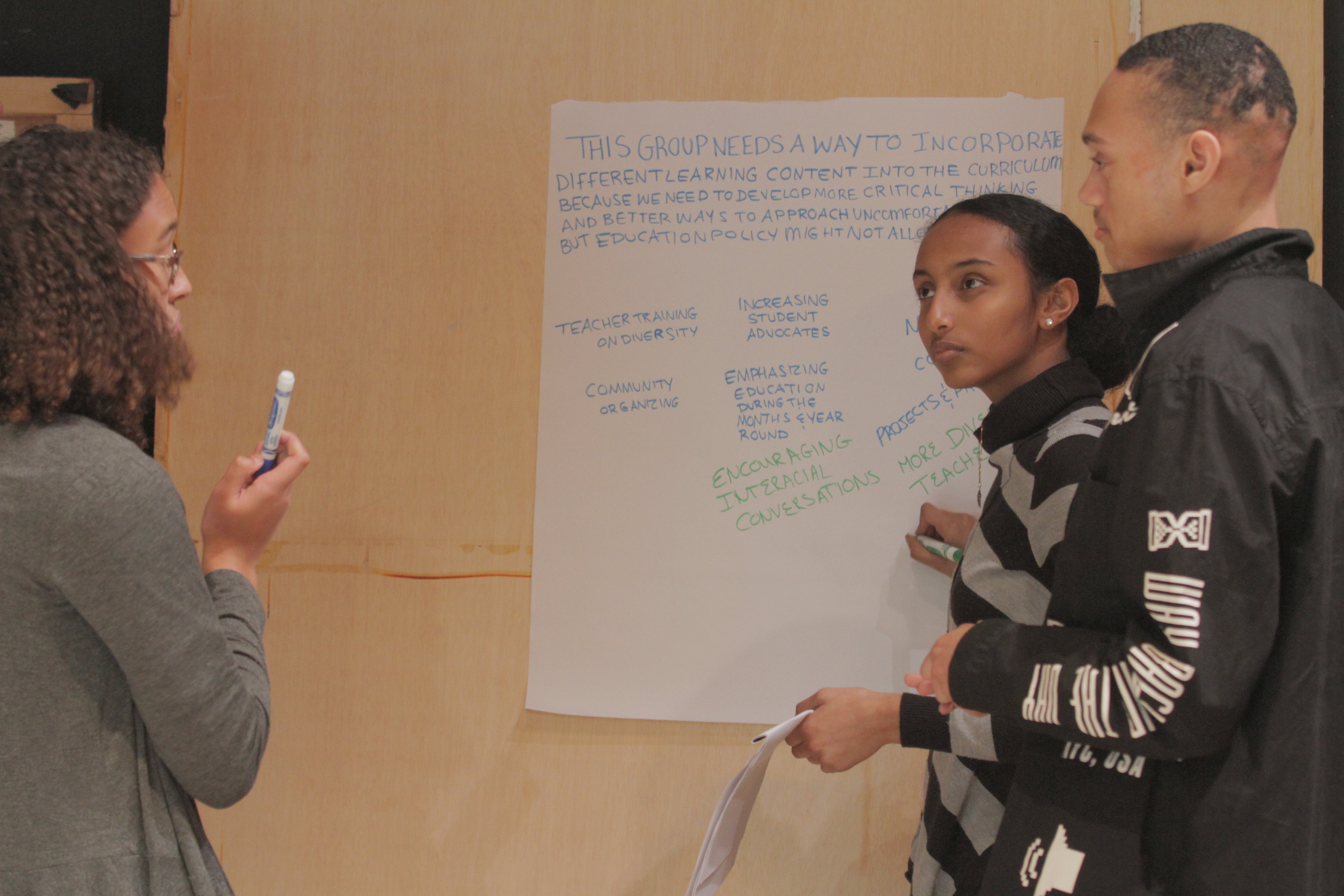 Dr. King’s Letter from Birmingham City Jail and Ta-Nehisi Coates’ Color-Blind Policy, Color-Conscious Morality were among the materials that colored the conversation in session three. Here students were asked to assess the current state of our union and the evolving strategies of leadership. The conversation turned political when participants were prompted to predict a path forward given the changes we can expect from the knowledge we currently have. While opinion varied in respect to the current direction of race relations in our nation, all youth expressed hope and optimism when asked to define what their own roles might be in shaping the world we live in. In teams of four to six, students developed solutions to interrupt inequity. Solutions included a peer mentor program, a student advisory council, a student leadership committee, and recurring roundtable discussions.