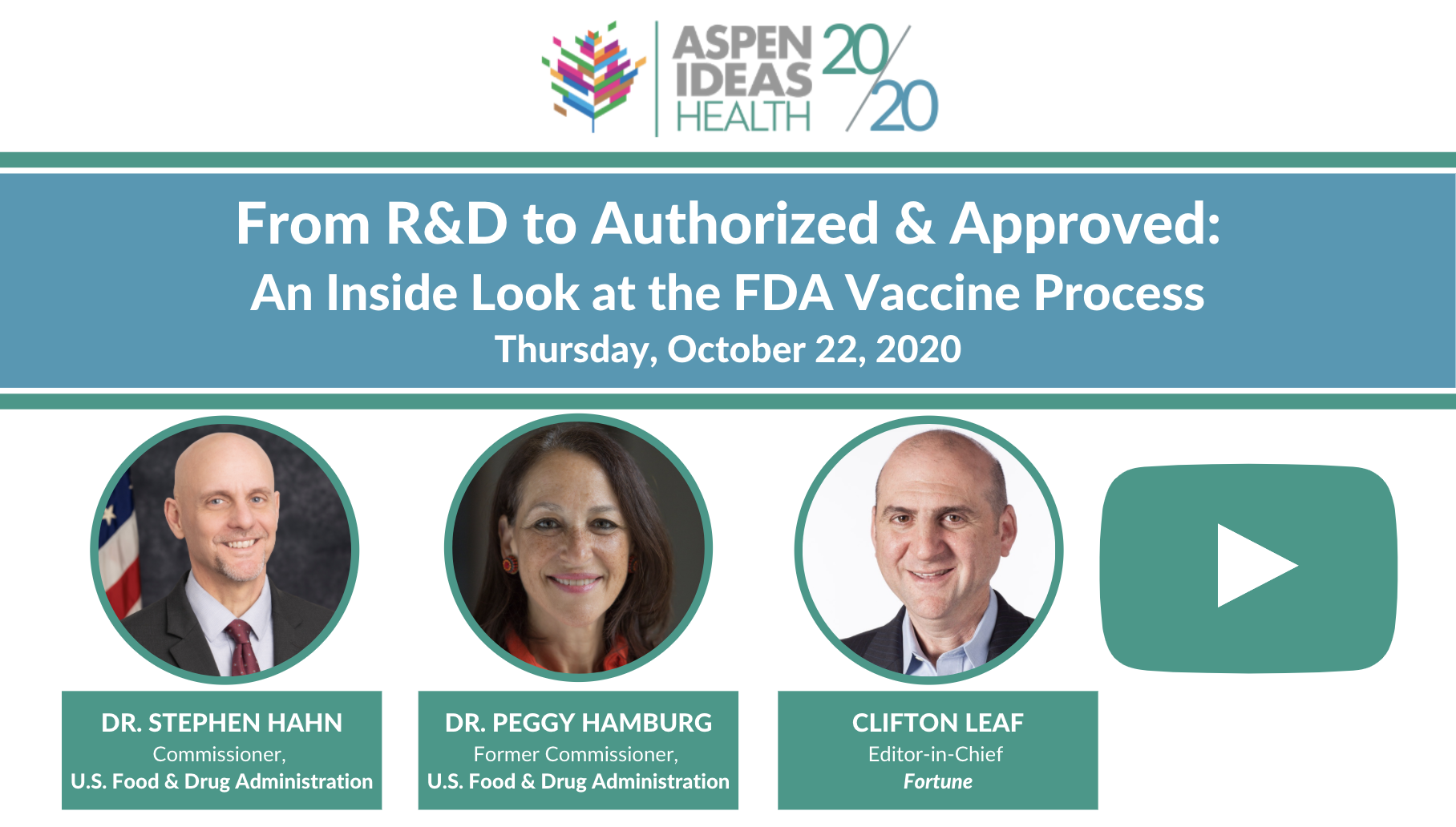 Join us as we explore the process of vaccine development, authorization or approval, and deployment with Obama Administration FDA Commissioner Dr. Peggy Hamburg and current FDA Commissioner Dr. Stephen Hahn. The conversation was moderated by veteran health journalist and editor of Fortune Magazine, Clifton Leaf.